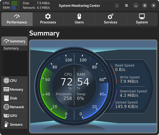 В случае с Linux стоит обратить внимание на утилиту System Monitoring Center, которая мониторит потребление аппаратных и системных ресурсов в реальном времени и отображает это всё в виде графиков.