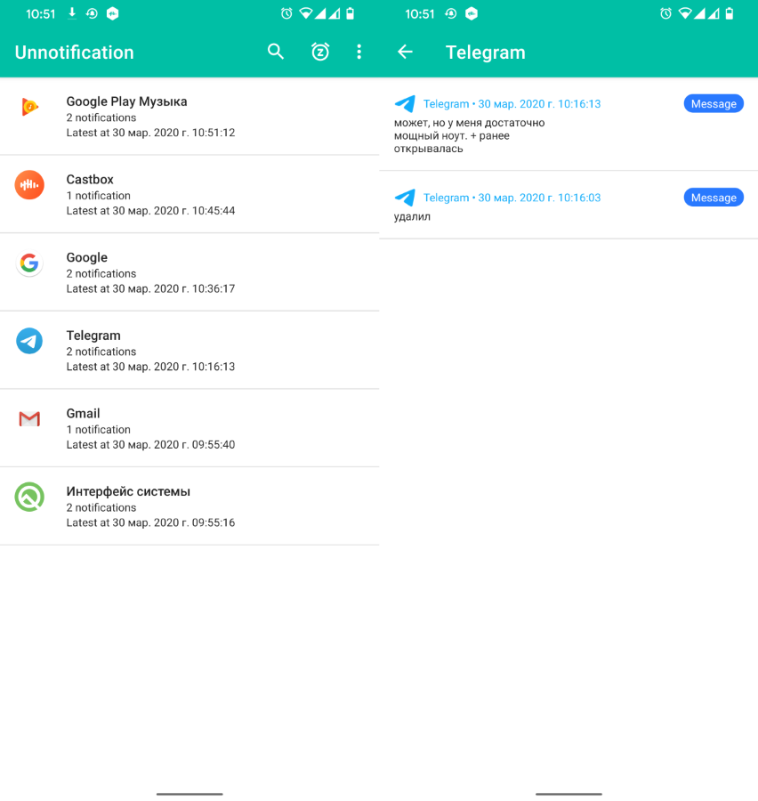 Все закрытые оповещения логируются в приложении и доступны для повторного просмотра. Для этого нужно просто выбрать приложение в журнале.
