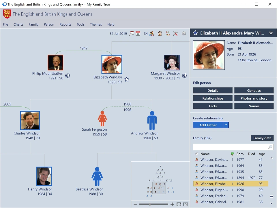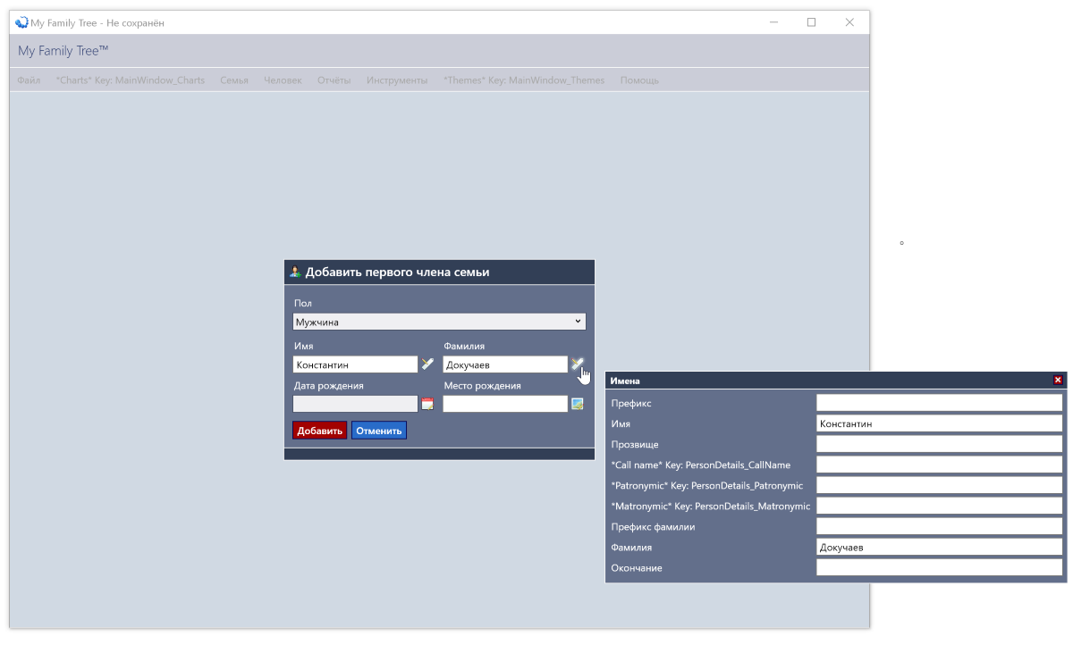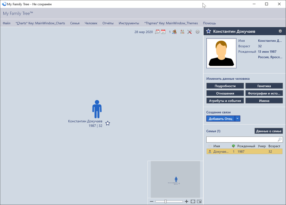 Или частично переведённый на русский интерфейс. Всё это, в конечном счёте, не мешает работе с самим деревом, и за пару минут можно составить хотя бы базовую «карту» отношений.