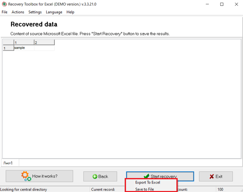 Последний шаг он важный самый. Он работает только в том случае, если программа Recovery Toolbox for Excel зарегистрирована. Иначе, сохранение данных в новый файл будет недоступно.