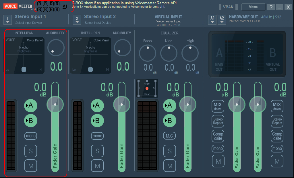 На первый взгляд разобраться с приложением достаточно просто. При этом разработчики не забыли и про различные продвинутые фишки. Так, в верхней части окна указан статус подключения Voicemeeter Remote API и аудиокабеля.