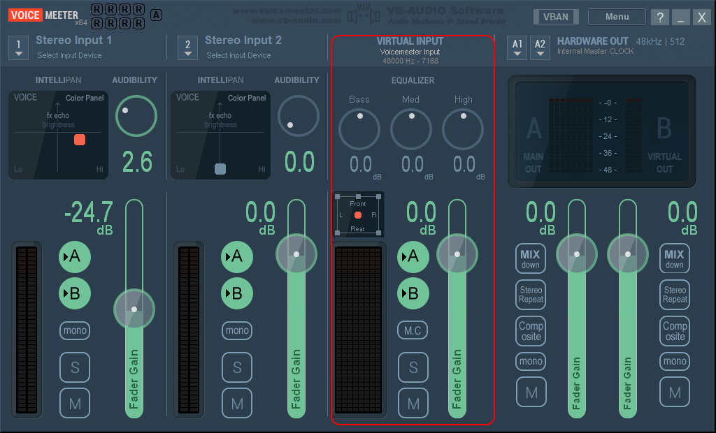 У виртуального входа аудио дополнительно можно менять уровни баса, средних и высоких частот, изменить расположение аудио (лево, право, сзади, спереди).