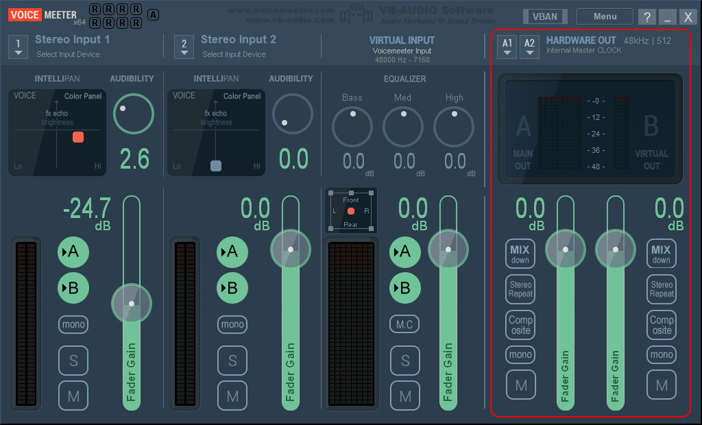 А у каждого входящего источника звука можно выставить индивидуальные параметры эквалайзера в Intellpan, указать уровень разборчивости голоса в Audibility. Кроме этого, источник звука можно привязать к определённой шине, выводить звук в mono-режиме, выставить уровень Gain или полностью его заглушить.