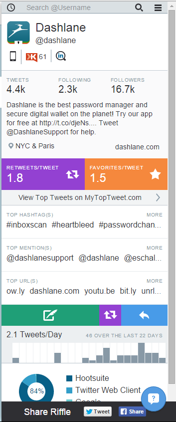 При клике по имени пользователя в Twitter Riffle покажет сводную информацию по аккаунту. Откуда он, количество твитов, ретвитов. Используемые устройства и многое другое: