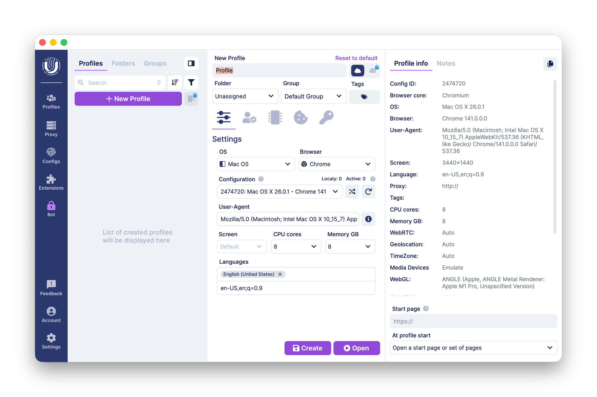 When creating a new profile, you can assign it to a folder or group and add tags. You can also define all required User Agent parameters for future sessions: