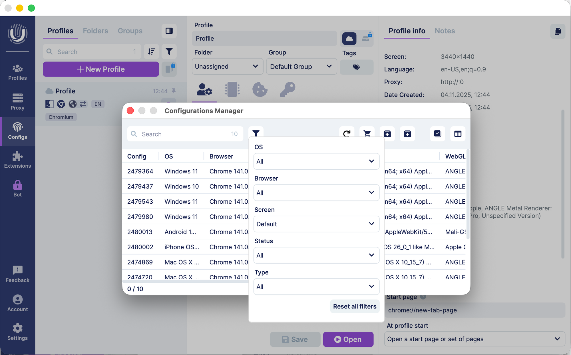 To start working with a selected profile, simply launch it — a new browser window will open with the specified parameters.