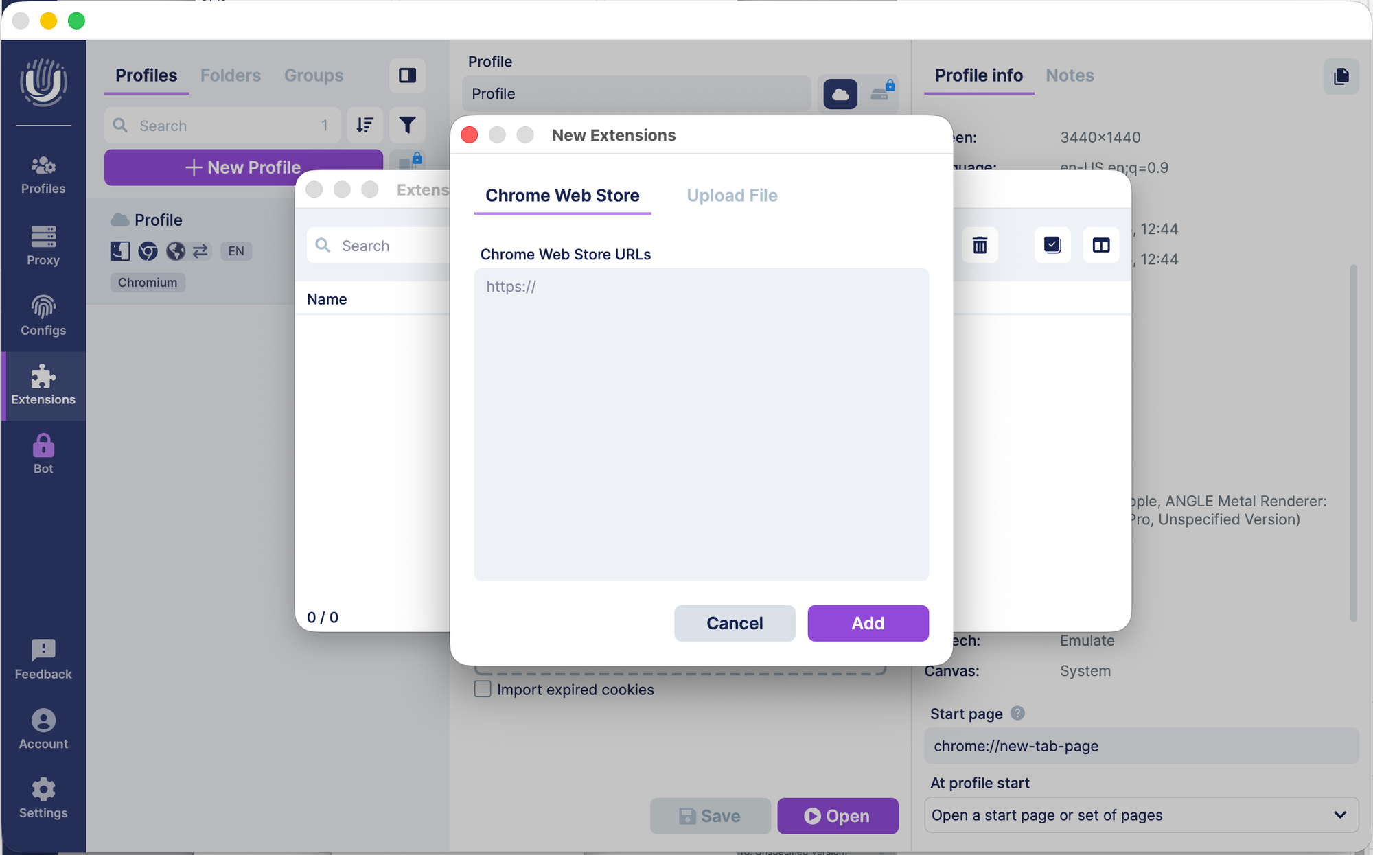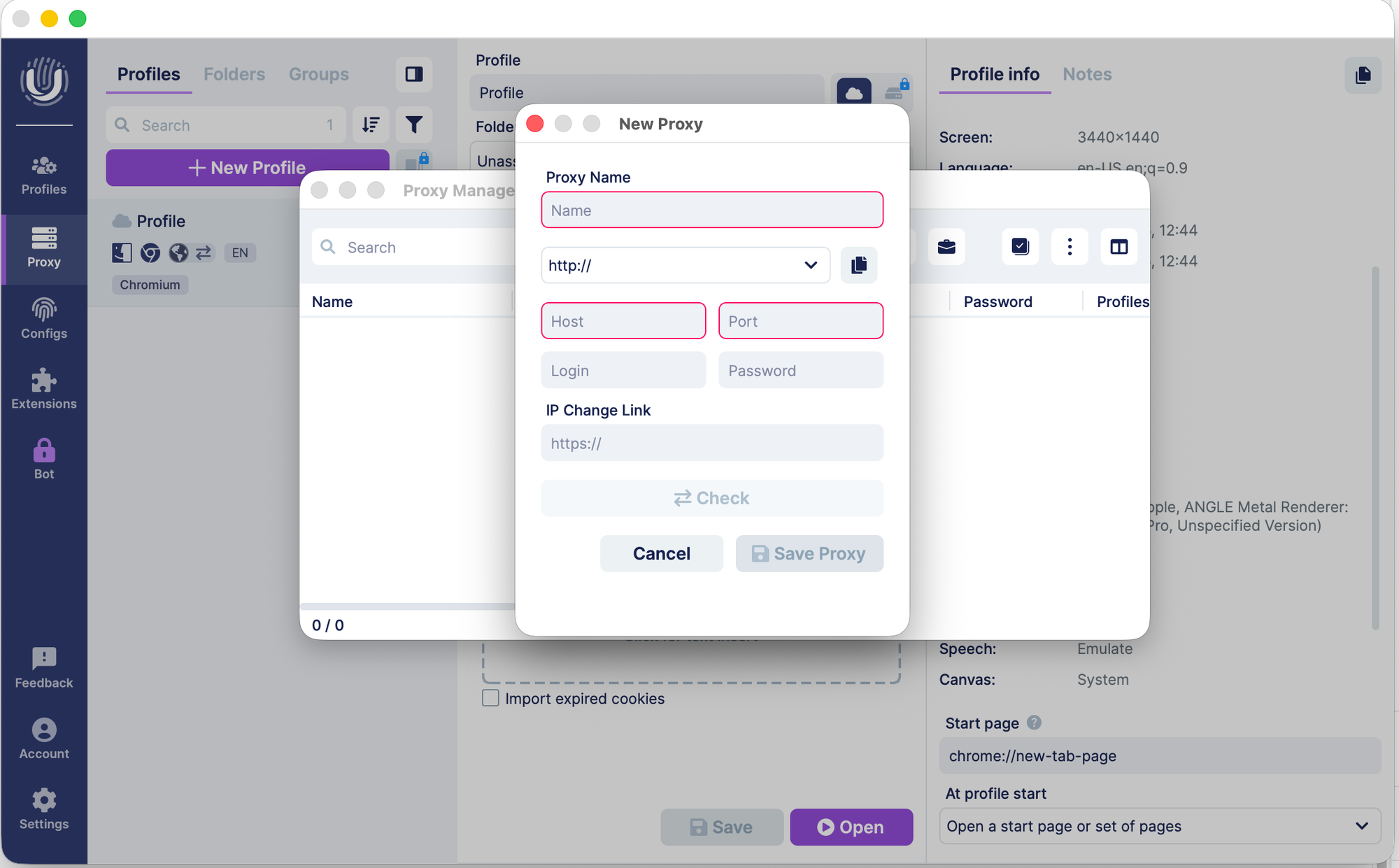In the Proxy section, you can add your own proxy settings. Unlike competitors, Undetectable does not provide built-in proxy options, so you’ll need to obtain them yourself.