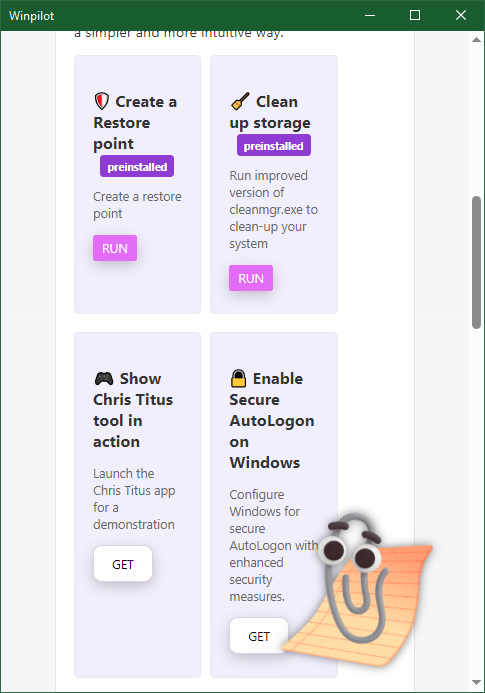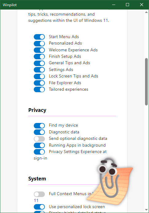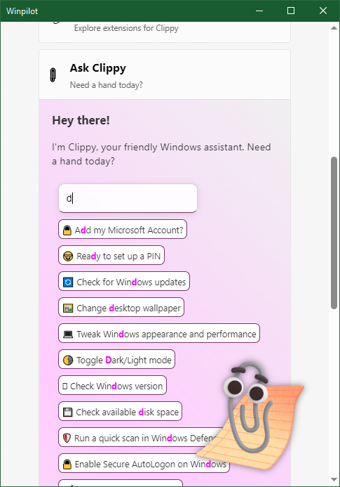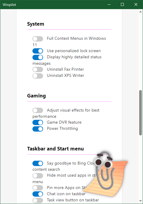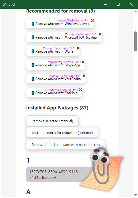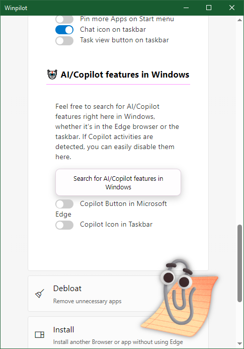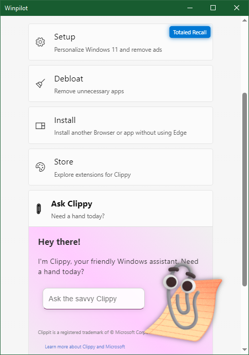 Сделать это можно с помощью утилиты Winpilot, которая является продолжением другого проекта Bloatynosy to BloatynosyAI. И с её помощью можно не только получить полезные советы от Скрепыша, но и провернуть несколько других полезных штук.