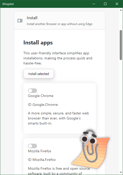 Не шибко полезный пункт Install, учитывая, что вы как-то уже скачали Winpilot. Здесь можно установить браузеры и мастхев приложения. Будет полезно на чистой системе, если вам западло открывать Edge.