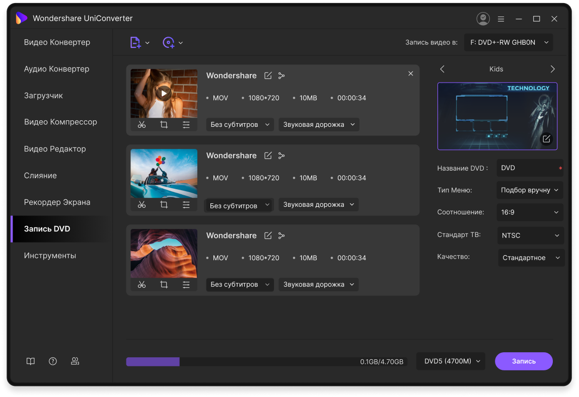 Инструмент позволяет записывать видео и аудио контент на DVD, CD или Blu-Ray без потери качества. Вы также получаете возможность настроить шаблоны меню DVD, чтобы сделать ваше содержание DVD более привлекательным.